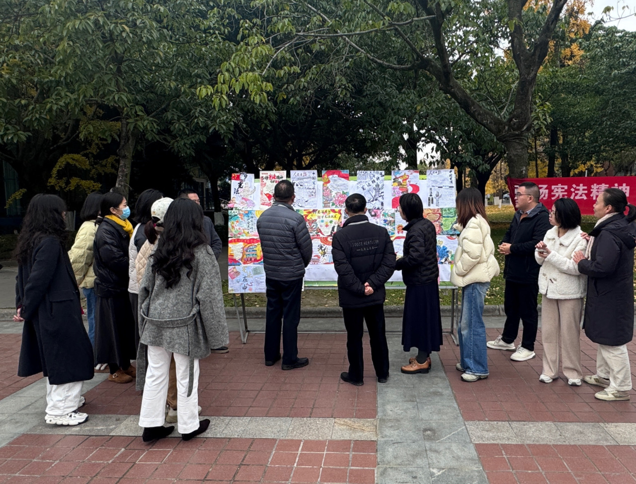 当天,在学校中心花园集中展出从600余份手抄报作品中遴选出的21幅优秀作品,生动呈现了同学们对宪法的理解与尊崇。学校党委书记何志州、副校长易贤文、马克思主义学院院长张大能亲临现场指导,与全体思政课教师一同驻足欣赏、交流点评,并对本次主题教育活动的意义给予充分肯定。