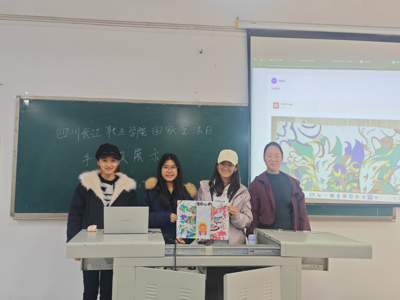 马院以2025级全体学生为主体,依托《思想道德与法治》课程,将宪法教育融入课堂教学。活动前期,采取班级动员、小组协作的形式,组织学生围绕宪法主题创作手抄报,并在课堂分享创作成果。教学中,思政教师通过开设“宪法讲堂”、开展知识竞赛等生动形式,深入阐释宪法知识、弘扬宪法精神。